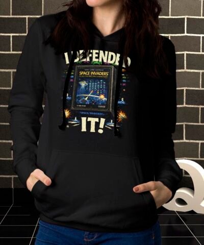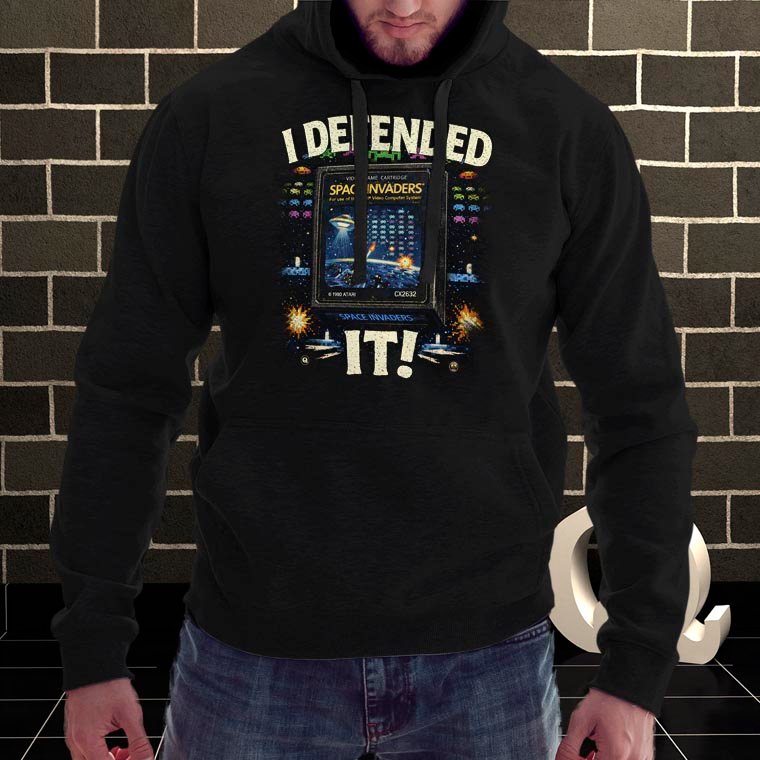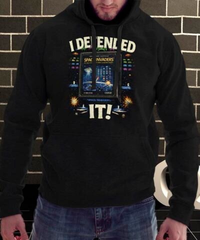 Espectacular buzo canguro estampado de la linea I Played It del juego Space Invaders.